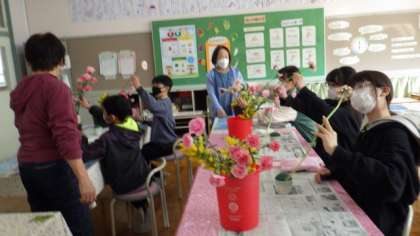 3月17日 6年卒業式に飾る生け花 公開日 2023/03/17 更新日 2023/03/17 各学年から 3月17日 6年卒業式に飾る生け花 地域学校共働本部主催で、6年生の生け花講習が開催されました。講師の方に教えていただきながら、卒業式の会場や控室に飾る花を自分たちで生けました。今年も会場が晴れやかな雰囲気になりそうです。 6年
