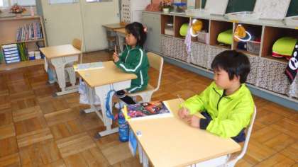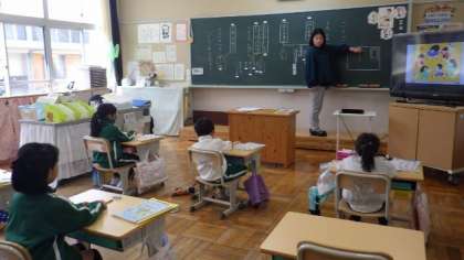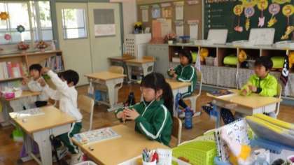 4月11日 1年国語 鉛筆の持ち方など、学習のためのポイントを先生と一緒にやってみていました。