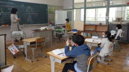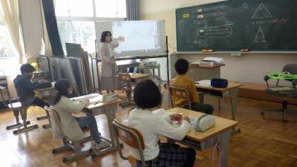 正三角形と二等辺三角形の角度について学習しています。見つけたことを発表していました。
