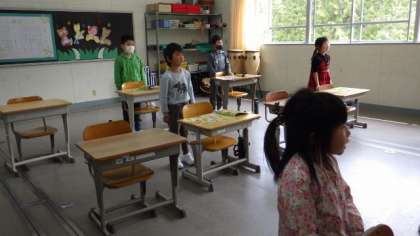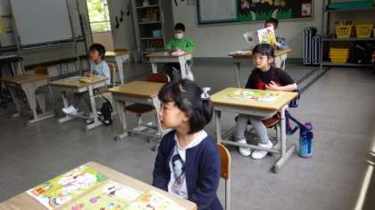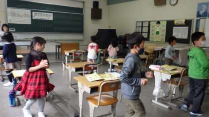 4月19日 1・2年音楽 歌に合わせて手拍子を打ったり、ぐるぐる回ったりしています。