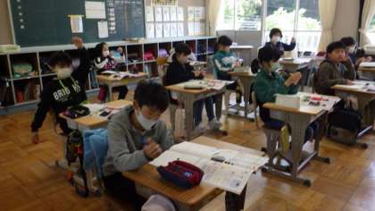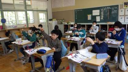 4月28日 5・6年理科 振り子の学習です。振ってみて気付いたことを発表していました。