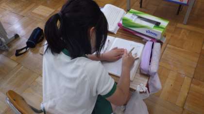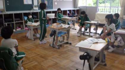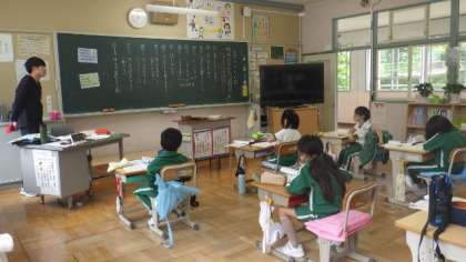5月23日 3・4年国語 黒板を見ながら学習の振り返りをしています。