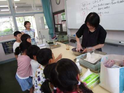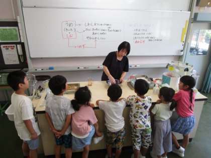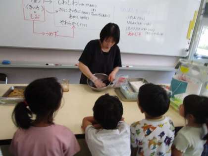 いよいよ梅干しを漬ける準備です。先生が赤紫蘇に塩を入れてもんでいます。みんなはその変化にびっくりしながら見ていました。