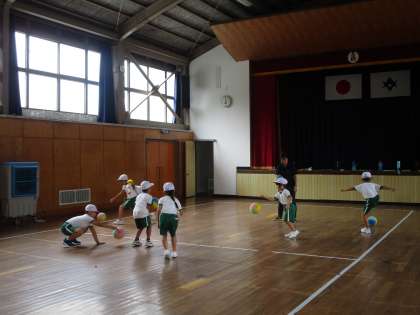 ボールを転がしたり、受け取ったり、ドリブルしたりしています。「あんたがたどこさ」にも挑戦していました。