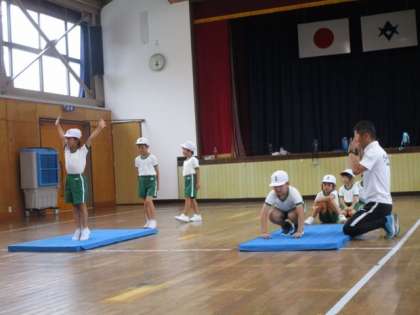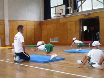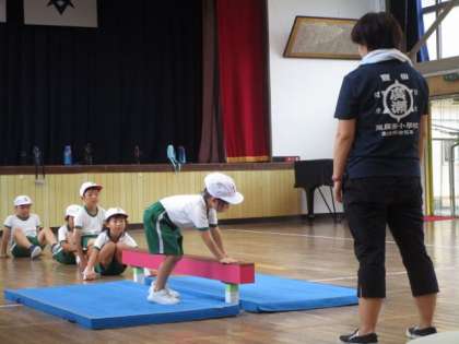 跳び箱を跳ぶ前に、手で体を支える運動を行っています。マットや平均台を使って体重移動の練習していました。