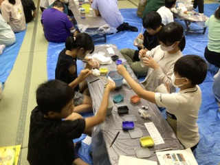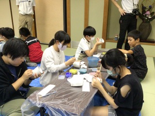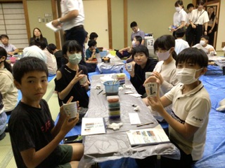 夕食後、旅館で清水焼の絵付け体験を行いました。修学旅行の思い出などを湯呑に描いていました。