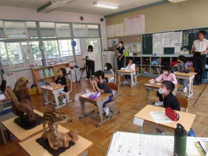 9月25日 3・4年総合的な学習の時間 公開日 2023/09/25 更新日 2023/09/25 各学年から 9月25日 3・4年総合的な学習の時間 地元の猟師さんからのお話2回目です。ジビエ料理についてお話を聞いています。 3年 4年