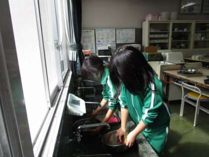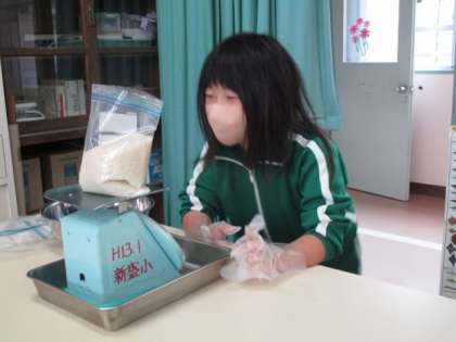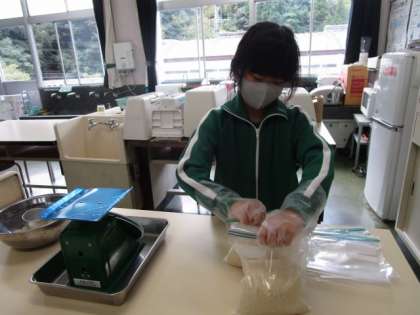 「重さ」の単元で学習した物の測り方の力を使って、みんなで田植えしたできたお米を測っています。全校24名分のお米を慎重に5合ずつ測って、持ち帰りのパックに入れていました。
