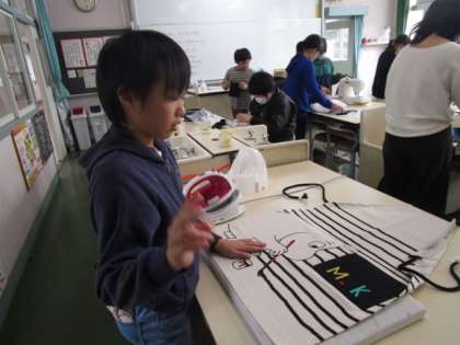 エプロンとナップサックがいよいよ完成です。きれいに仕上げようと集中していました。