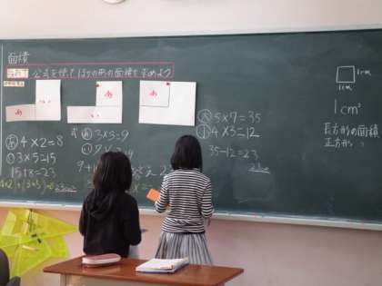 10月23日 4年算数 公開日 2023/10/23 更新日 2023/10/23 各学年から 10月23日 4年算数 工夫してL字型の図形の面積を求めています。自分の考え方を互いに発表していました。 4年