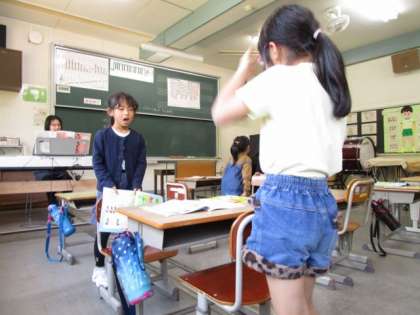 「やまびこごっこ」を役割を決めて歌い合っています。呼びかける言葉も、みんなで考えていました。