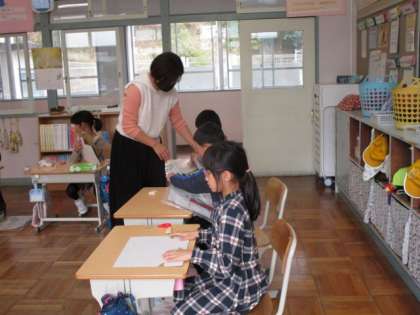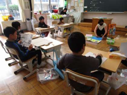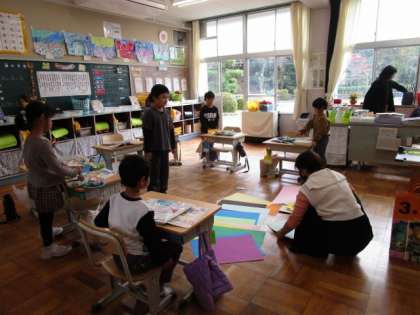 お話を箱の中に表現する作品です。何色の画用紙をベースにするか、選んで貼っていました。