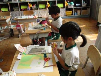 「お話の世界」を作っています。自分のイメージに合った色画用紙の上に、海の生き物や動物などを作って構成していました。