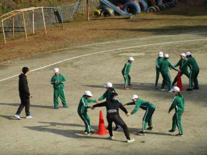 11月28日 5・6年体育 公開日 2023/11/28 更新日 2023/11/28 各学年から 11月28日 5・6年体育 手をつないだまま、「前へ」「外へ」「左へ」「右へ」などの指示どおりに動いたり、逆の動きをしたりしています。言葉と反対の動きは難しそうでした。 5年 6年