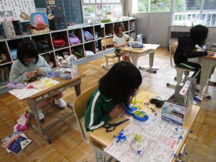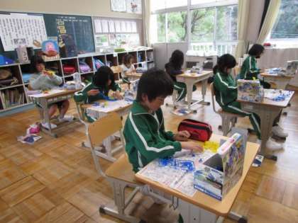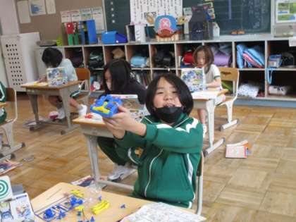 電気の学習の一環で、乾電池で動く車のおもちゃを組み立てています。説明書をよく読み、慎重に組み立てていました。