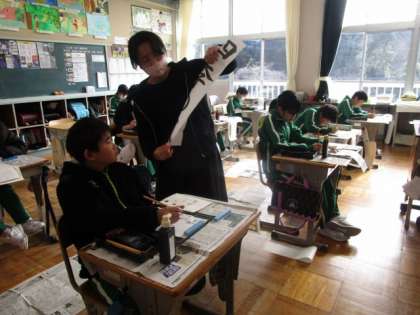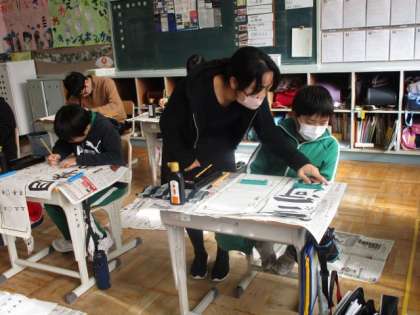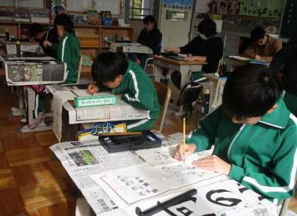 12月19日 5・6年書写 公開日 2023/12/19 更新日 2023/12/19 各学年から 12月19日 5・6年書写 書き初めの練習です。条幅に名前をバランスよく書く練習をしています。 5年 6年