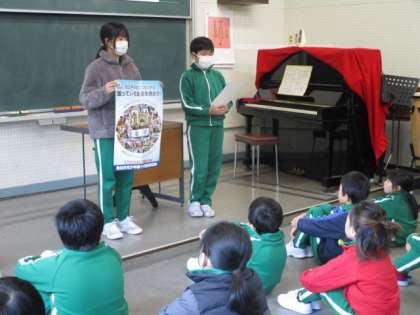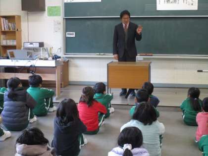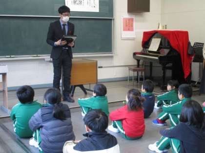 令和6年の始まり。全校で集まり、校長先生のお話を聞き、委員会のお知らせや係の先生のお話を聞きました。