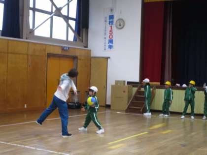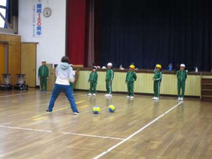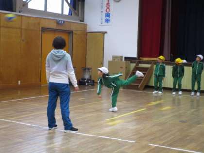 ボールをうまく投げる動きを確かめています。脚の動きに気を付けていました。