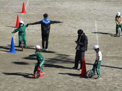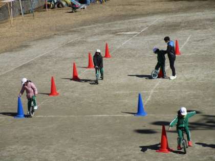 2月13日 3・4年体育 明日の一輪車検定に向けて練習しています。