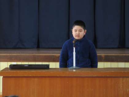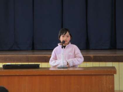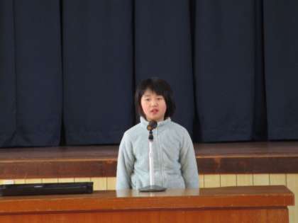 今年度最後の日、修了式を行いました。各学年代表の「今年度頑張ったことと来年度の目標」についてのスピーチ、終了証の授与、はげみ賞の授与と続き、校長先生から「この1年よく頑張った」とのお話がありました。そして、校歌斉唱で式を締めくくりました。