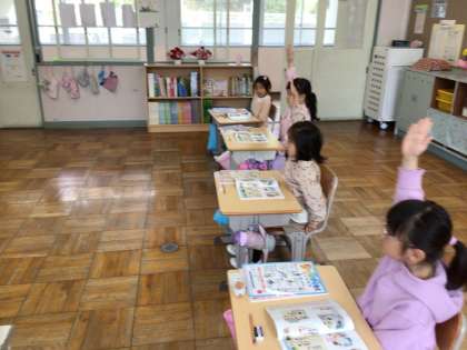 1年生は、道徳の学習で、あいさつについて学習していました。元気よく手をあげてあいさつの言葉をたくさん見つけていました。