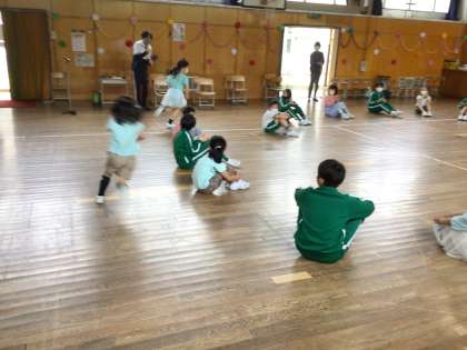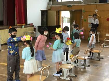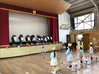 一年生を迎える会では、一年生にインタビューをしたり、先生クイズやハンカチ落としなどのゲームをしたりしました。ハンカチ落としは全校児童でとても盛り上がりました。プレゼントや、一緒にがんばろう、仲良くしようねという言葉をもらい、一年生もとても嬉しそうでした。