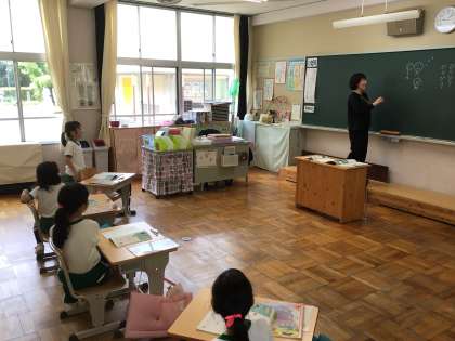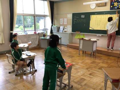 1年生は濁音の入った言葉集めをしました。発表する人の方に体を向けて聴くことができます。みんなでたくさんの言葉を集めて、元気よく読み合いました。