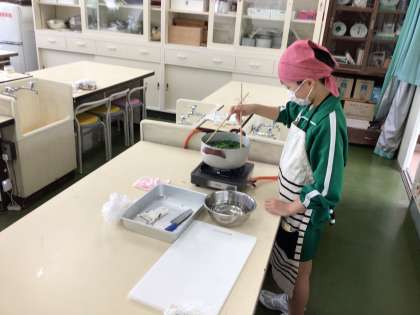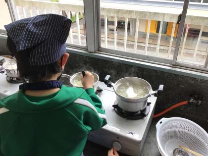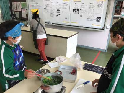 5、6年生は家庭科で調理実習をしました。5年生はじゃがいもを、6年生はほうれん草を茹でました。じゃがいもは粉ふきいもにし、塩こしょう味で食べました。ほうれん草はおひたしにして食べました。茹で加減も塩加減も抜群で、子どもたちも、もう少し食べたかったと話していました。