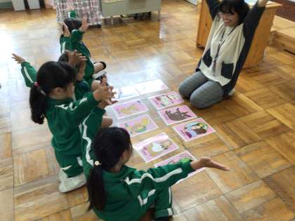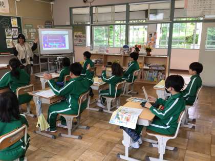 ALTの先生と一緒に各学年で学習しました。5、6年生は自己紹介の仕方を練習していました。3、4年生はジャスチャーをつけて英語で意思表示する方法を練習していました。1、2年生は自分の気持ちを伝える言葉を覚えていました。