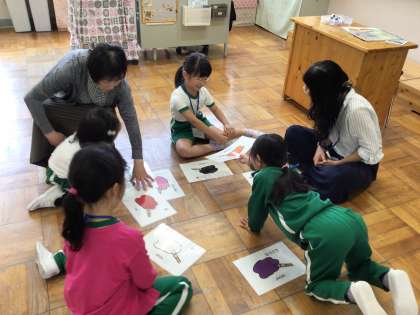 1年生は、外国語の学習で、色の言い方を覚えました。学習の最後には、友達が欲しいといった色のカードを、どうぞと英語で伝え、渡していました。