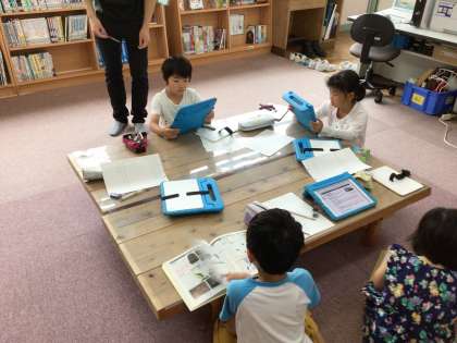 2年生は、生活科の学習で、昨日、たくさん見つけたヤゴについて、種類や飼い方を調べました。昨日見つけた場所のことを思い出して、あの川も水が冷たかったから、冷たい水もヤゴは好きだよと友達に話す子もいました。