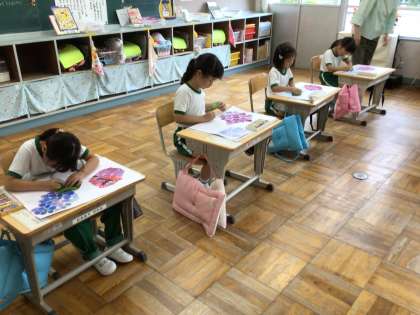 1年生は、図工の学習で紫陽花の絵を描いています。紫陽花の花、一つ一つの色をかえたり、葉っぱの形をよく見て写したりしました。とても素敵な紫陽花の絵に仕上がりそうです。