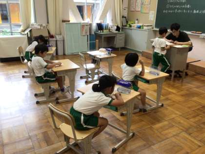 2年生は、生活科の学習で、先週の探検で見つけた川の生き物の様子を観察して、絵や文にまとめていました。じーっと生き物の動きを観察している子もいました。