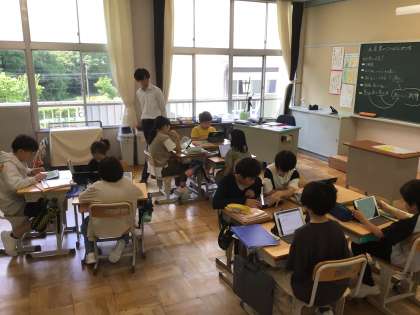 5、6年生は、社会科の学習で「水産業のさかんな地域」の学習が始まりました。グループに分かれ、「なぜ日本の魚は質が高いのか」について予想をしました。話し合われたことをタブレットにまとめ、全体発表の時に提示しました。