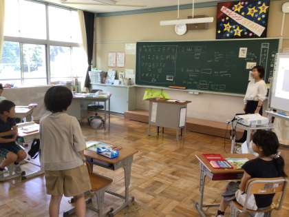 3、4年生は、外国語活動で、〇〇が好きですか?とどのようにたずねるのか、また、それについてどのように答えるのかを学びました。子どもたちが、一人一人、先生からたずねられたあと、子どもたちの方から「私たちも先生にきいていいですか」と言い、全員が先生に質問の文を使いたずねていました。