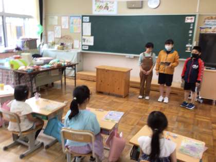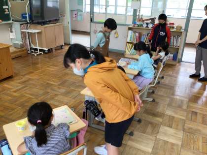 休み時間に、すこやか委員会の子どもたちが、学校保健委員会で使うアンケートの説明をしていました。まず、学校保健委員会では、どんなことをするのかについて、分かりやすく伝えていました。1年生がアンケートに答える時には、困っている子のそばにいき、相談にのっていました。