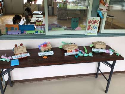 1年生は図工で「ぱくぱくぱっくん」の学習をしました。紙袋をくしゃくしゃにし、何の動物の口に見えるかを考えながら作りました。どの動物もとてもかわいいです。