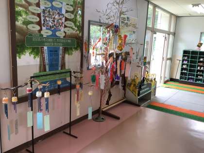 5、6年生は、図工で風鈴を作りました。パイプの長さは、自分で選び、音を決めました。自分の書いた一行詩もつけました。毎日、涼しげな音が鳴り響いています。