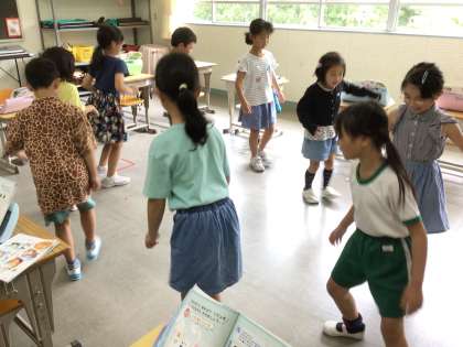 1、2年生は、音楽で「しろくまのジェンカ」の学習をしました。歌だけでなく、ジェンカの踊りも覚えて踊りました。歌を覚える時には、自然とリズムにのって体が動いている子もいました。