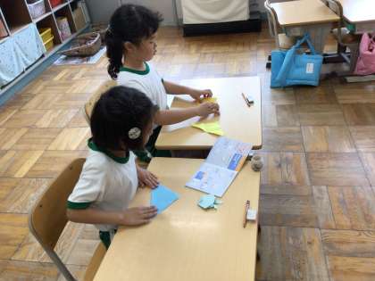 朝の学習で、学芸会で行う劇の台詞の練習をしていました。少しずつすらすらと言えるようになってきました。4時間目には、お休みしている友だちに折紙でプレゼントを作っていました。