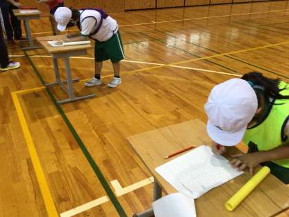 3.4年生は、ミニ運動会をしました。グループに分かれてリレーや玉入れなどをしました。リレーは速く走っていき、九九の問題をたくさん解きます。玉入れでは、玉の色によって点数が違います。マイナスになってしまう色もあり、他のチームにマイナスの玉を入れに行く子もいました。どの競技もとても盛り上がっていました。