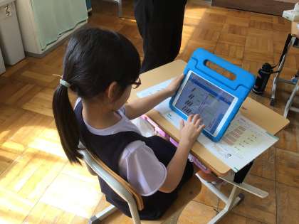 算数でかけ算の学習をしています。5の段の九九では、どのように答えが増えていくかについて考えました。タブレットを使い、5つずつ並んだブロックを動かしながら、答えが5つずつ増えることに気づきました。