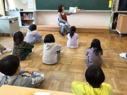 宮澤賢治原作の「どんぐりとやまねこ」を読んでいただきました。「となりのせきのますだくん」の挿絵を描いた武田美穂さんが、この「どんぐりとやまねこ」の挿絵を描いています。少し難しいお話ですが、挿絵と読み聞かせをしていただく方の語りのおかげで、興味をもって聴くことができました。