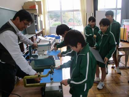 5・6年生は図工「糸のこすいすい」の様子です。糸のこを使ってオリジナルの立体オブジェを作っています。はじめは機械の操作に緊張していた子も、慣れてくると上手に直線やカーブに沿って板を切っていました。完成が楽しみです。
