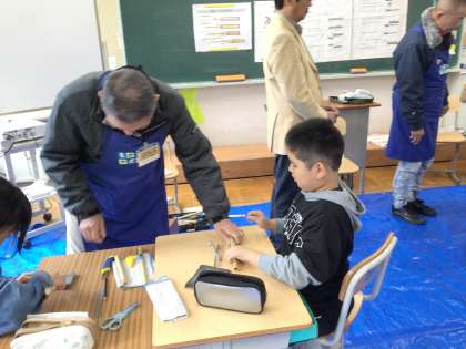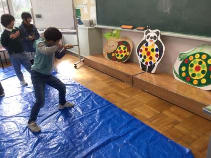 豊田市のものづくりサポーターさんに教えていただきながら、竹鉄砲を作りました。竹を切ったり、竹に入れる棒にヤスリをかけたりして作りました。出来上がった竹鉄砲で的当て大会もしました。竹鉄砲からなぜ玉が発射するのか、仕組みを教えてくれた子もいました。的当て大会では、ポンという気持ちのよい音が聞こえ、高得点連発でした。