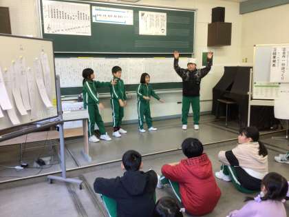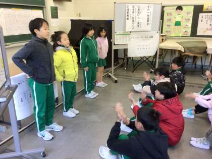 今日の一行詩集会では、全校児童が夏休みから11月までに作った一行詩について、自分が一番好きな一行詩を発表したり、班に分かれて冬の合作一行詩を作り、劇風にして発表しあったりしました。冬の合作一行詩の優秀グループ作品は「百の星 ダイヤモンド 冬の空」でした。冬の空に広がる星のきれいな様子を伝えたかったようです。他の班も、季節が伝わる言葉を使ったり、動作などを書くことで「こたつ」という物や、その場にいる人の気持ちを想像してもらえるように言葉を選んだり工夫していました。