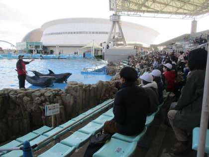 最後に全校でイルカショーを見ました。体重の重いイルカ達のジャンプの高さに、こどもたちはとても驚いていました。