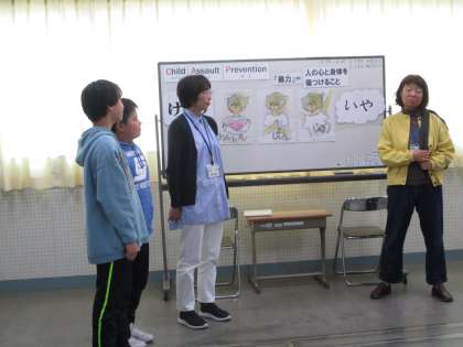 CAP教室(中・高学年) 公開日 2024/12/20 更新日 2024/12/20 全校での活動 高学年は、一方的にお金を渡せと言われたり、嫌な触り方をされたりする場面からの身の守り方をロールプレイ学びました。一人では「いや」と言えないときは、友達と一緒に言ったり、誰かに相談したり、その場から離れたりするなど、具体的な回避方法を教えていただきました。 3年 4年 5年 6年 行事