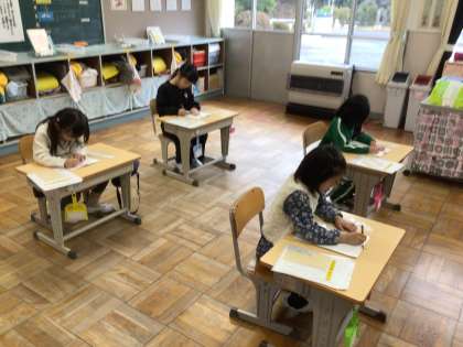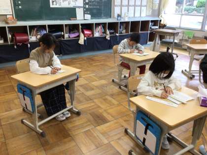 低学年は、鉛筆で手本となる文を書き写します。たくさんの字をじっくり見て書くので大変です。時間をたっぷり使って、一字一字丁寧に書き写すことができました。どの作品も冬休み前の練習より上達したものばかりでした。