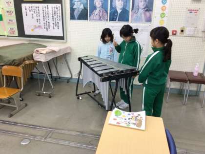 音楽で「きらきら星」を演奏しました。始めに鉄琴を3人ずつで練習しました。何度も同じ旋律をみんなで交代しながら練習しました。最後に鍵盤ハーモニカと鉄琴で合奏にしました。澄んだ音で素敵な合奏になりました。